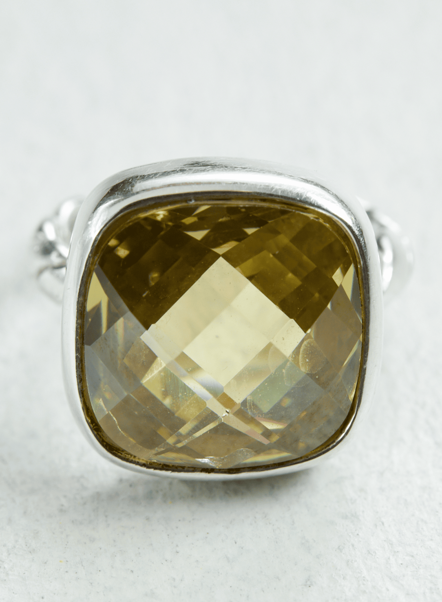 Make a statement with this stunning sterling silver square cocktail ring, featuring a captivating faceted green zircon. The twisted pattern on the band adds a unique and elegant touch, making this ring a standout piece in any jewellery collection.