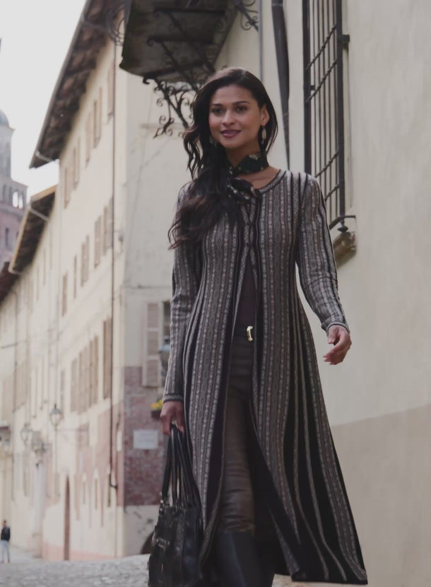 Showcasing patterned micro stripes from a 19th-century Indian textile, this striking dress is jacquard knit in dark tonal shades of stone, pewter, fig and truffle on black. Exquisitely engineered with textural links-knit godets for a flattering fit-and-flare shape. The dress can be opened to wear as a dramatic cardigan.