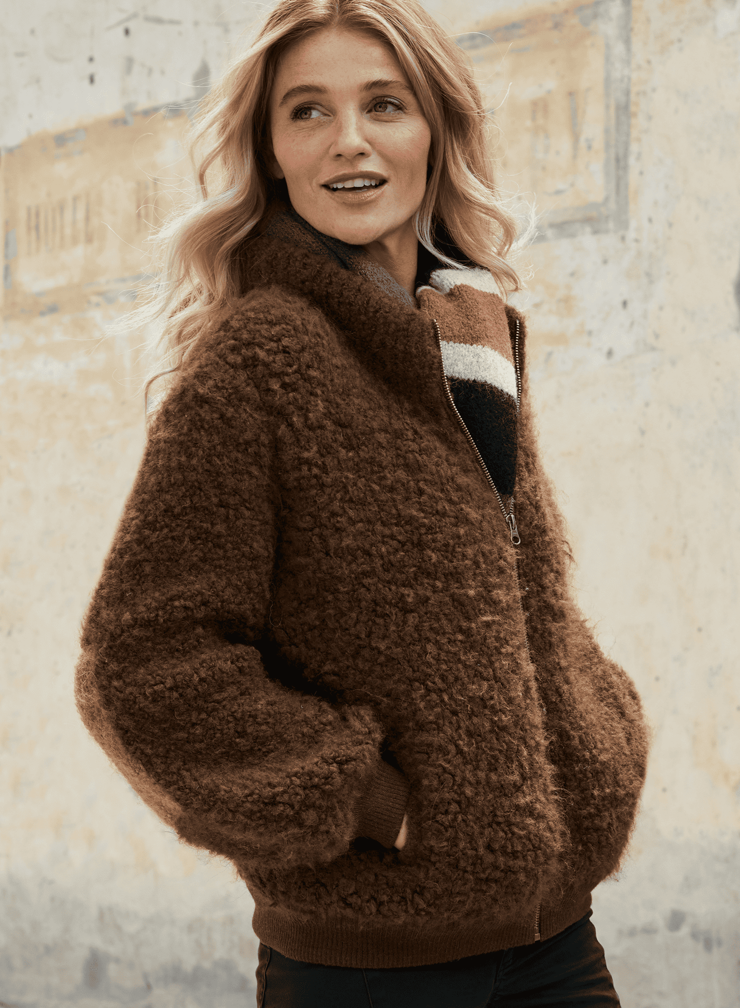 Our luxe take on the sporty bomber jacket is knit in a plush and fleecy sherpa. Detailed with a stand collar, zipper, ribbed trims, tonal elbow patches and pockets.