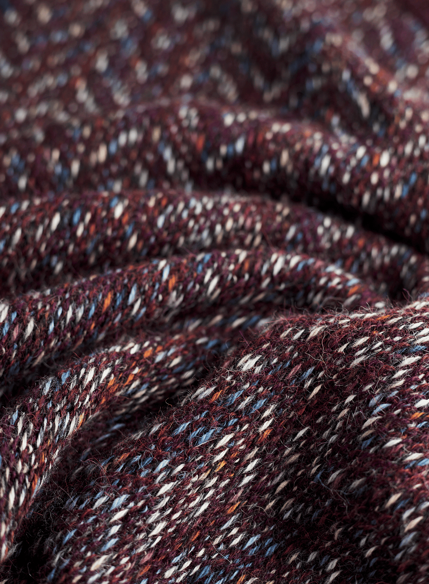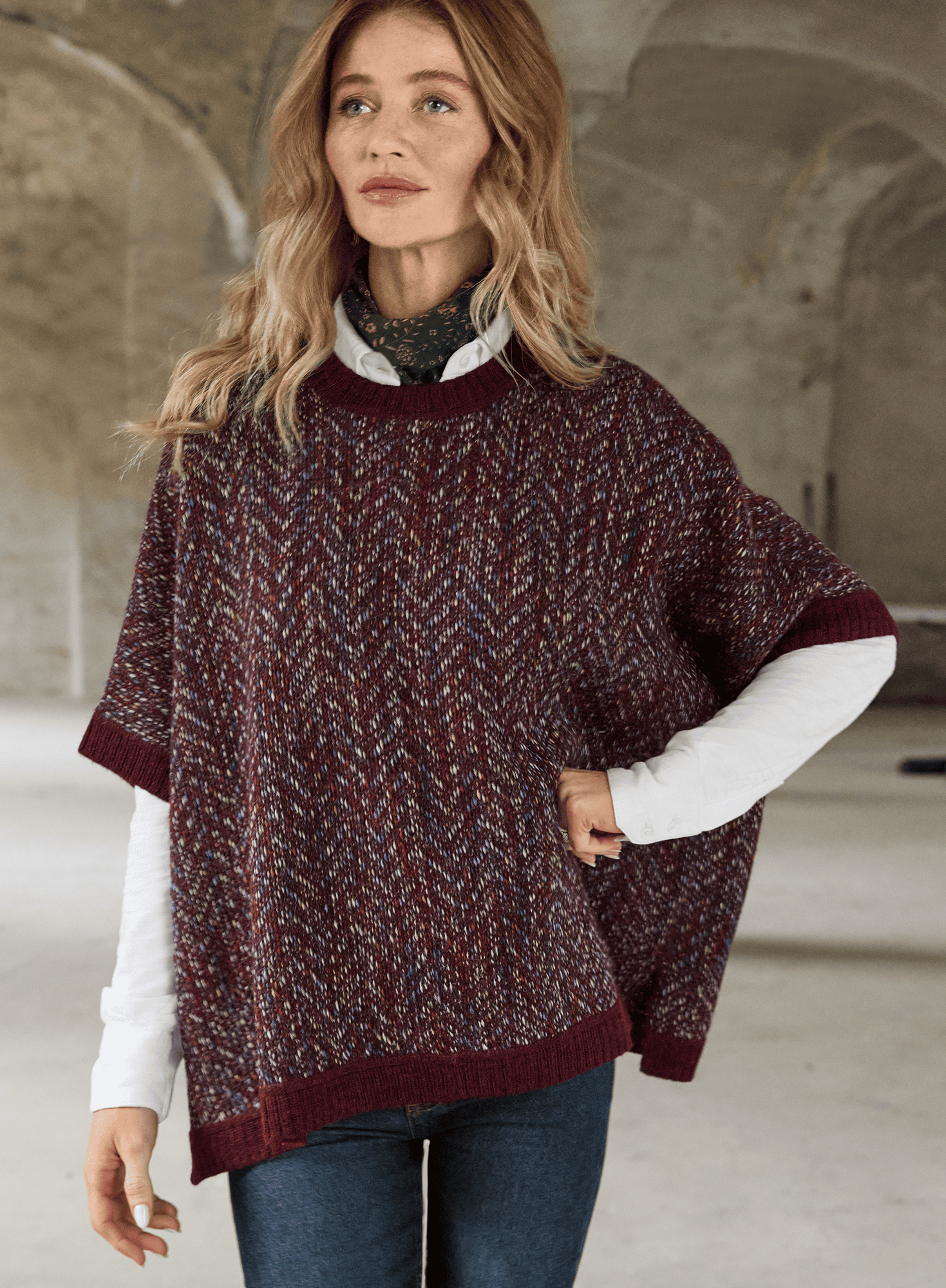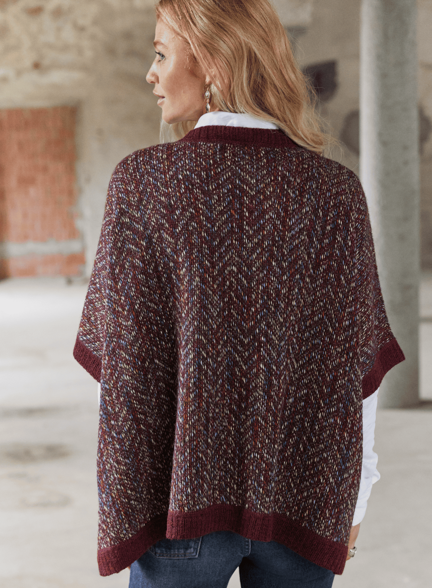 Knit in subtle columns of colour, the oversized top is a textural knit in hand-painted yarns of denim, taupe and saffron, grounded in Malbec. The loose, boxy style has dropped sleeve openings and side vents.
