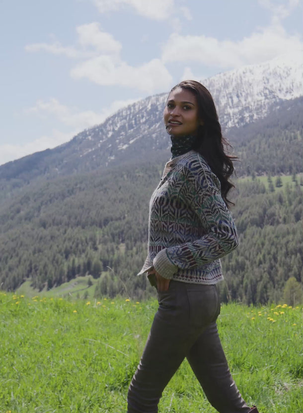 Motifs from an Indonesian ceremonial cloth pattern our cropped, boxy cardigan in muted jewel tones grounded in Limestone. Fair Isle knit with drop shoulders, dimensional seams and ribbed turn-back cuffs.