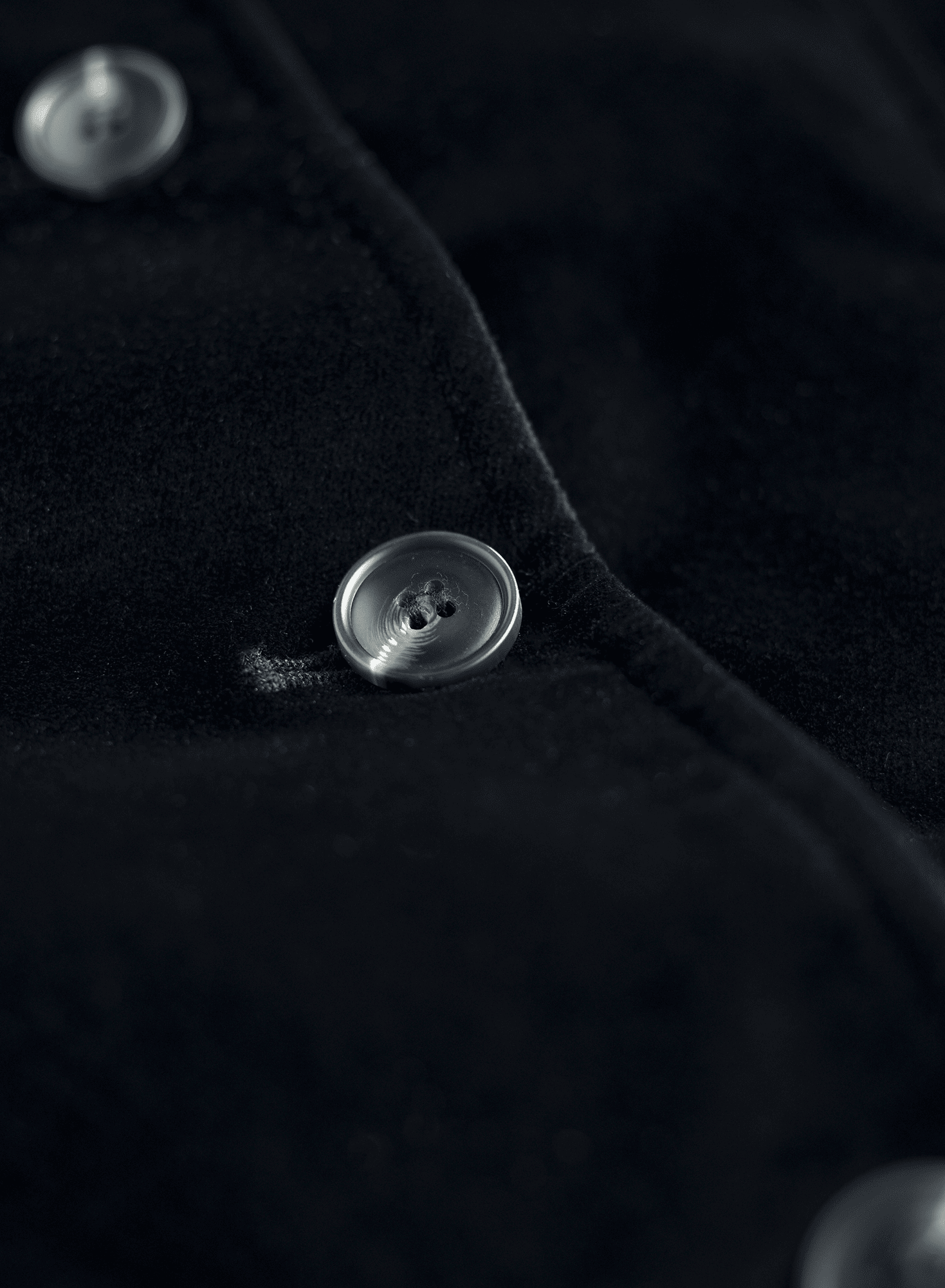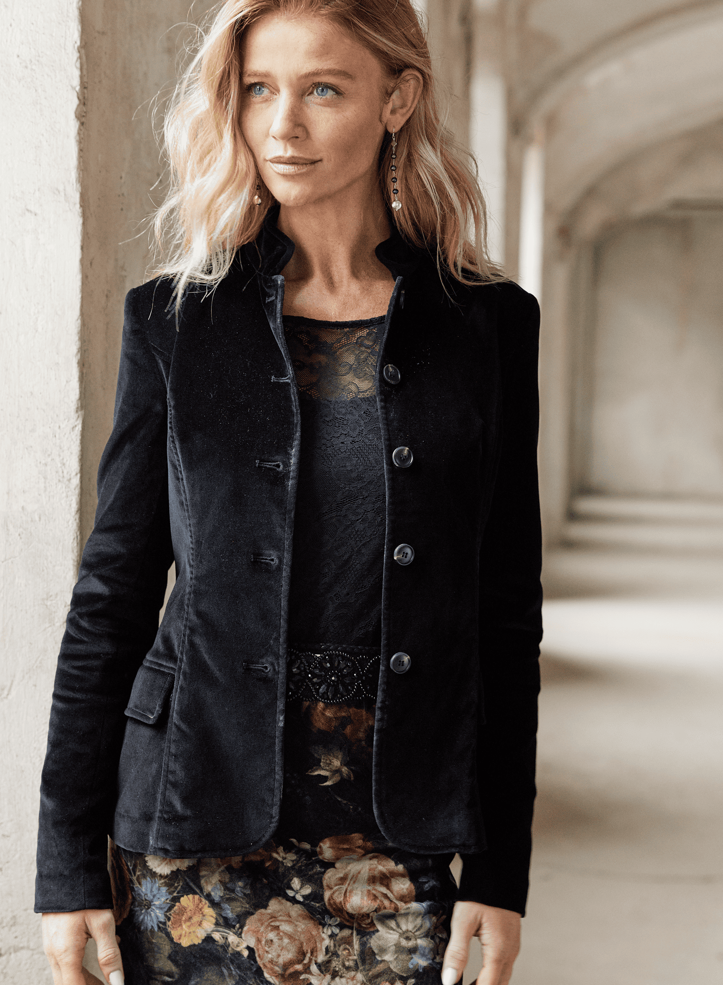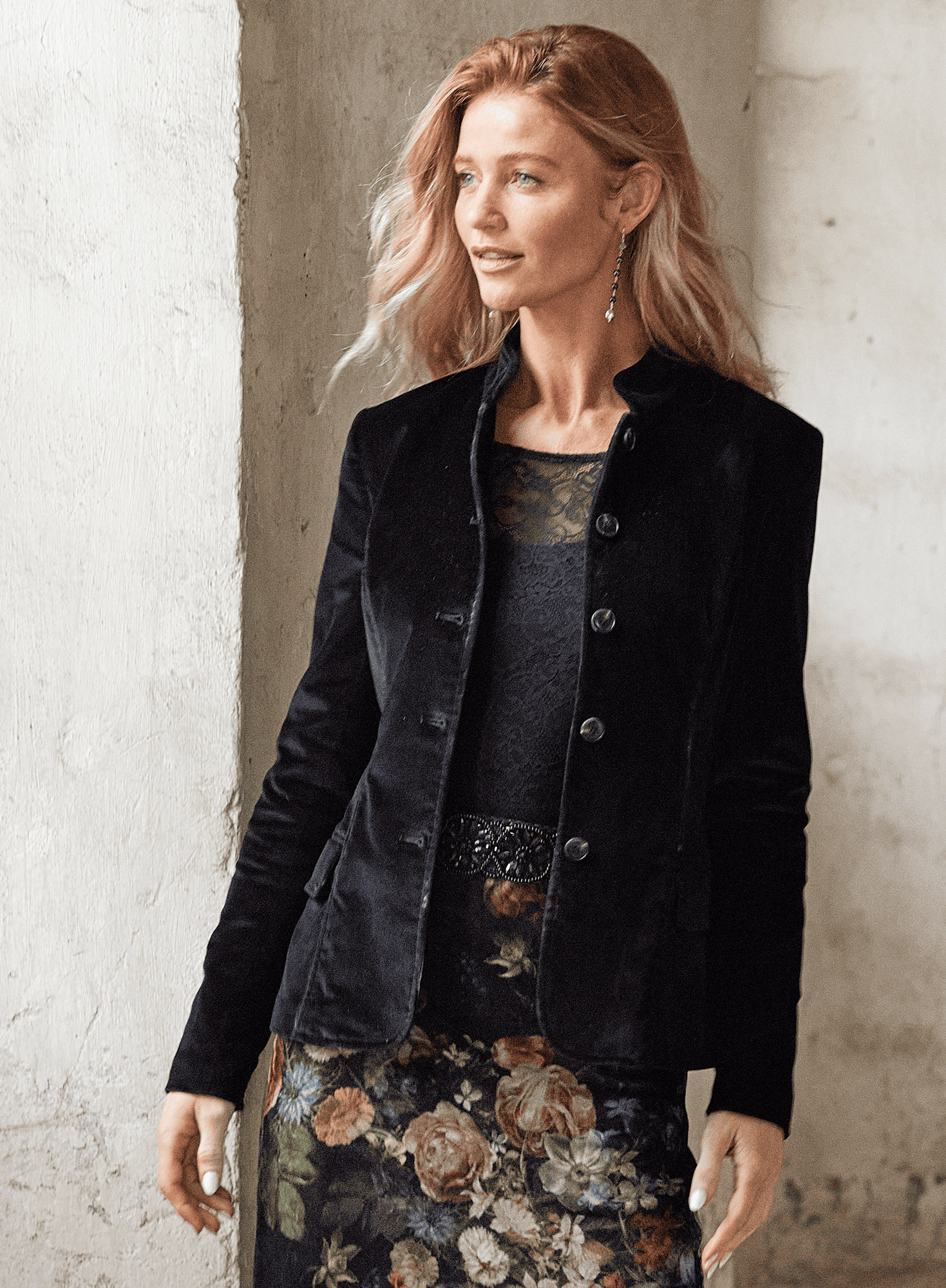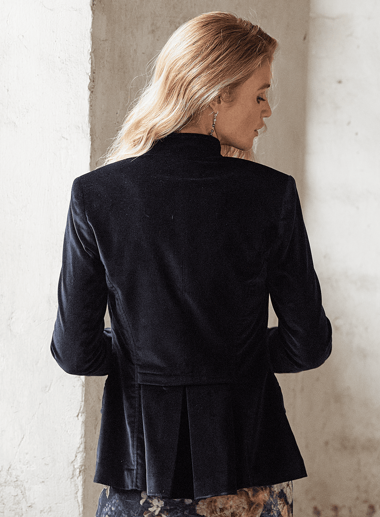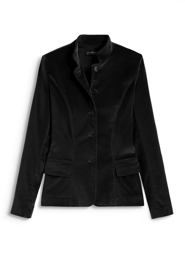 The military riding coat is softly reimagined in plush, stretch velveteen. Beautifully shaped and tailored with a convertible stand collar, pleated back peplum, front flap pockets and buttons. Lined.