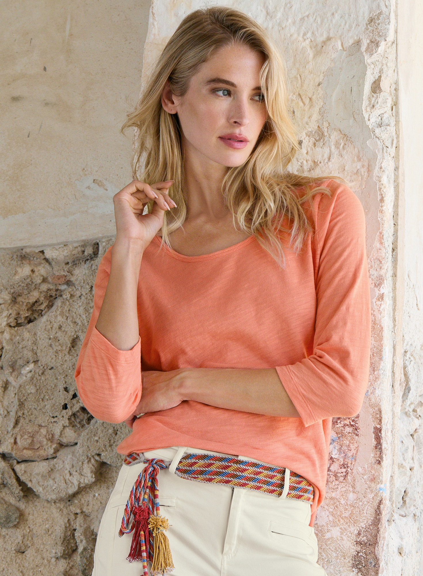 As fresh and cool as an ocean breeze, this easy cotton top is the epitome of spring in airy, lightweight, breathable jersey flamé. Scoop neck, 3/4-sleeves.