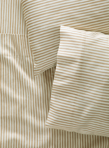 Hand-painted watercolor stripes of golden tan on ivory are perfectly imperfect as they wash across smooth, 200-thread-count cotton sateen. Sheet set includes a flat sheet, fitted sheet and two pillowcases (standard cases for Queen set; king cases for King and California King sets).