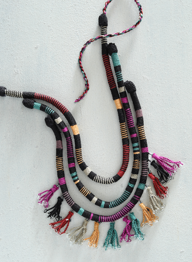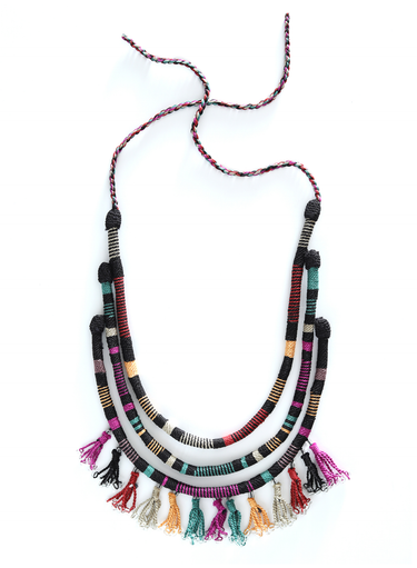 The show-stopping accessory is a triple-strand necklace of colorful, handwrapped Peruvian pima cotton, fringed with glass bead-tipped tassels. Varying stripes of yellow, burnt orange, stone, purple, and light teal are grounded on black for a dramatic finishing touch.