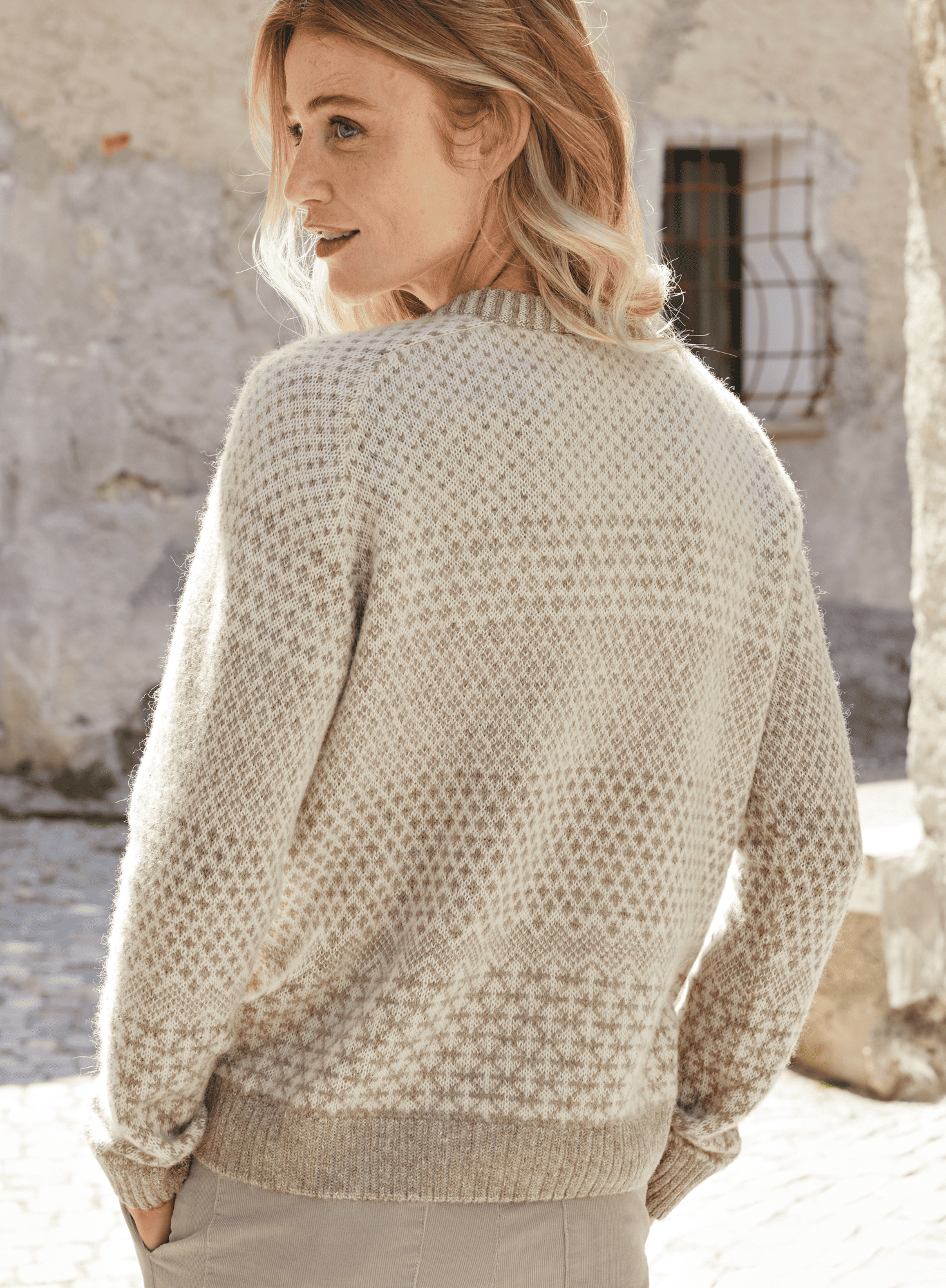 The finest woolen-spun royal alpaca yarns are full-fashion knit into a luxurious, boxy pullover in rich colors with fair isle striping that create an ombre effect. Styled with saddle seam shoulders and ribbed trim.