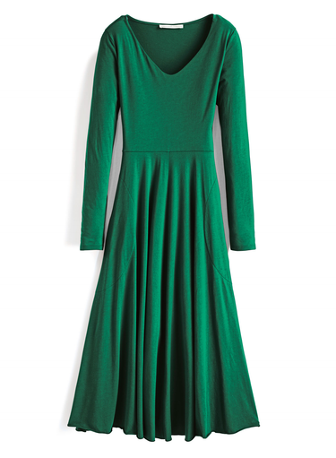 Our all-occasion dress is the essence of easy chic. Sewn of drapy pima jersey, it’s designed to fit and flare, with a v-neck and seamed waistline that releases to a twirlable hem; pockets. Evergreen or Black. Belt sold separately.