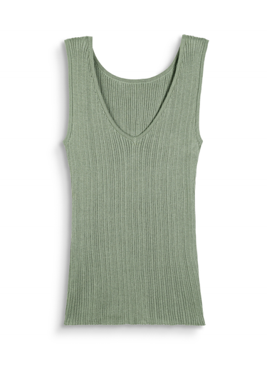 A refined essential with sculptural ease. Our fully-fashioned, sleeveless tank is knit from fine gauge Pima cotton in variegated ribs, offering a figure-slimming silhouette with subtle texture. Designed with wide straps, a deep V-neckline, and ribbed trim at the neck and armholes, it’s effortlessly wearable—like a tee, but elevated with clean lines and modern detail.