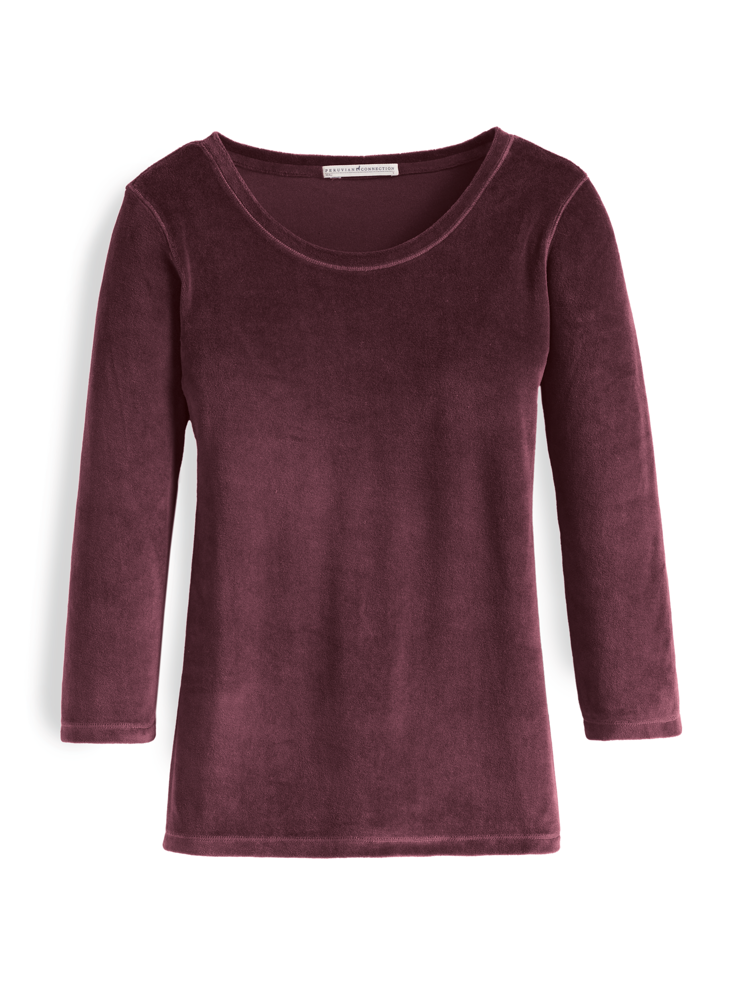 Our bestselling Carmel Top is reimagined in plush velour. Very flattering, with a round neck and slim, ¾-sleeves. Cotton (42%), modal (42%) and polyester (16%).